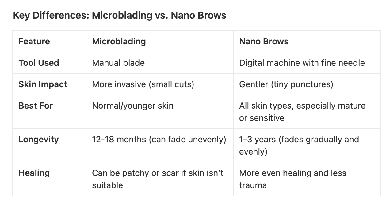From my professional experience, nano brows are the better choice for mature clients. As we age, the skin becomes thinner, more delicate, and often doesn’t heal as well from invasive techniques. Because microblading cuts the skin, it can cause more trauma and can lead to poor healing on ageing skin.